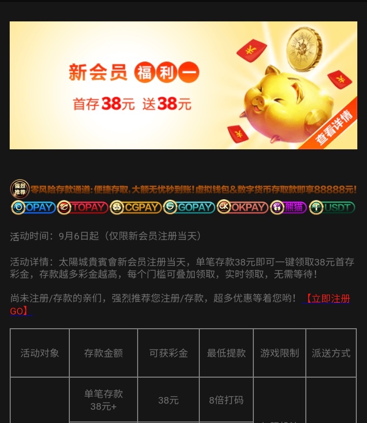 新用户注册24小时内。存款38元+在任务里领38,可以先打完本金再领。领了之后8倍水。 注册当天才行,过了一天就不能领取了,领了38后只可以玩电子 棋牌 捕鱼