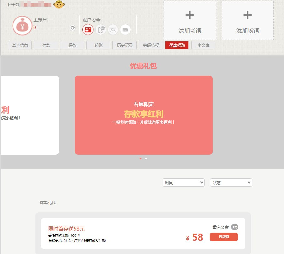 注册后到用户中心>优惠领取选择优惠,只能体育/电子