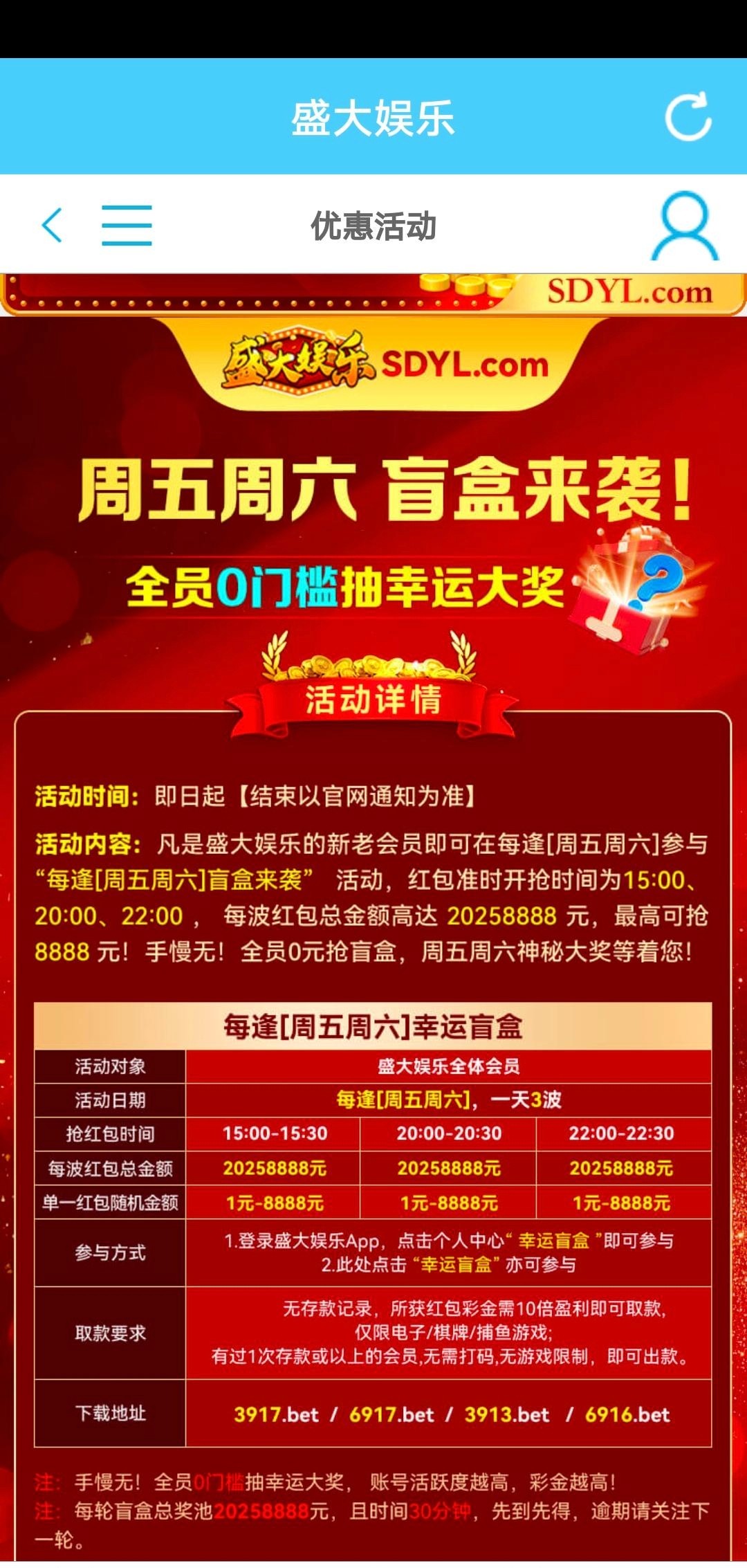 盛大娱乐盲盒新老会员都能参加 每周五周六下午15点20点22点都能抽盲盒,这台子十块钱起提。白嫖就行。网址跟活动详情看图,老会员登录一下还有个神秘彩金刚送的