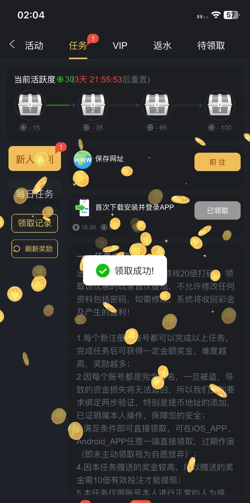 没有充值过 就领取过回访彩金8元 无聊登录看到任务有18 下载就可以领取