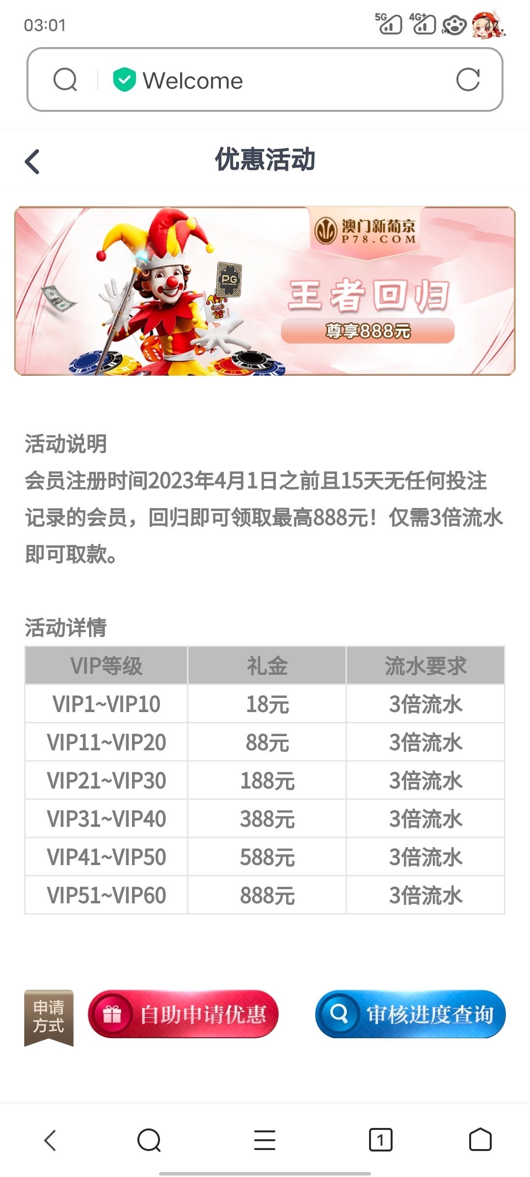 4.1日之前注册并且15天内没有任何流水记录的 在优惠大厅-王者回归里申请回馈彩金18-888 限制棋牌/电子/捕鱼
