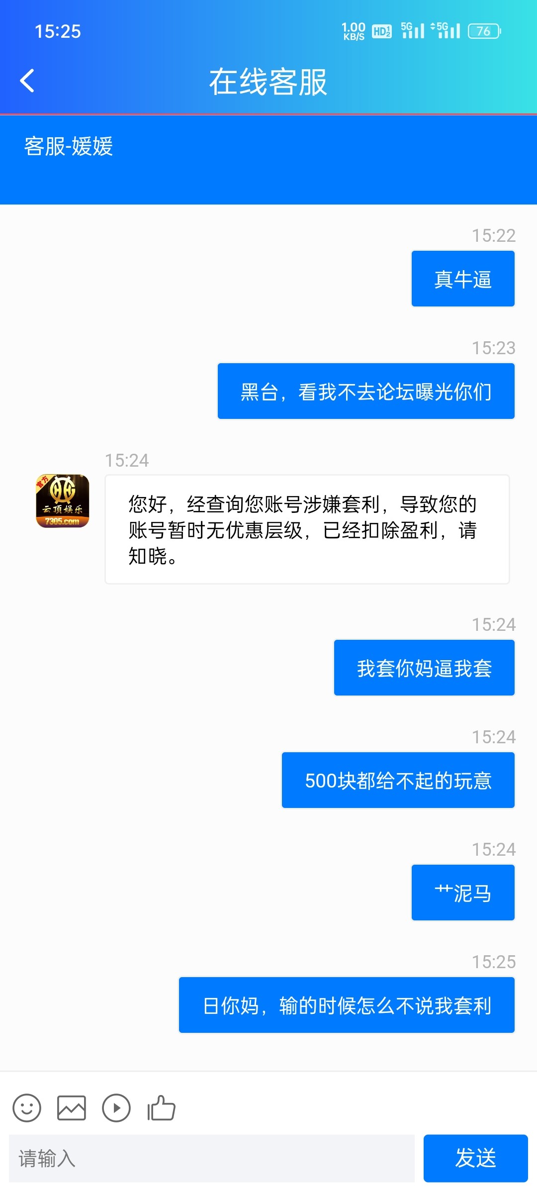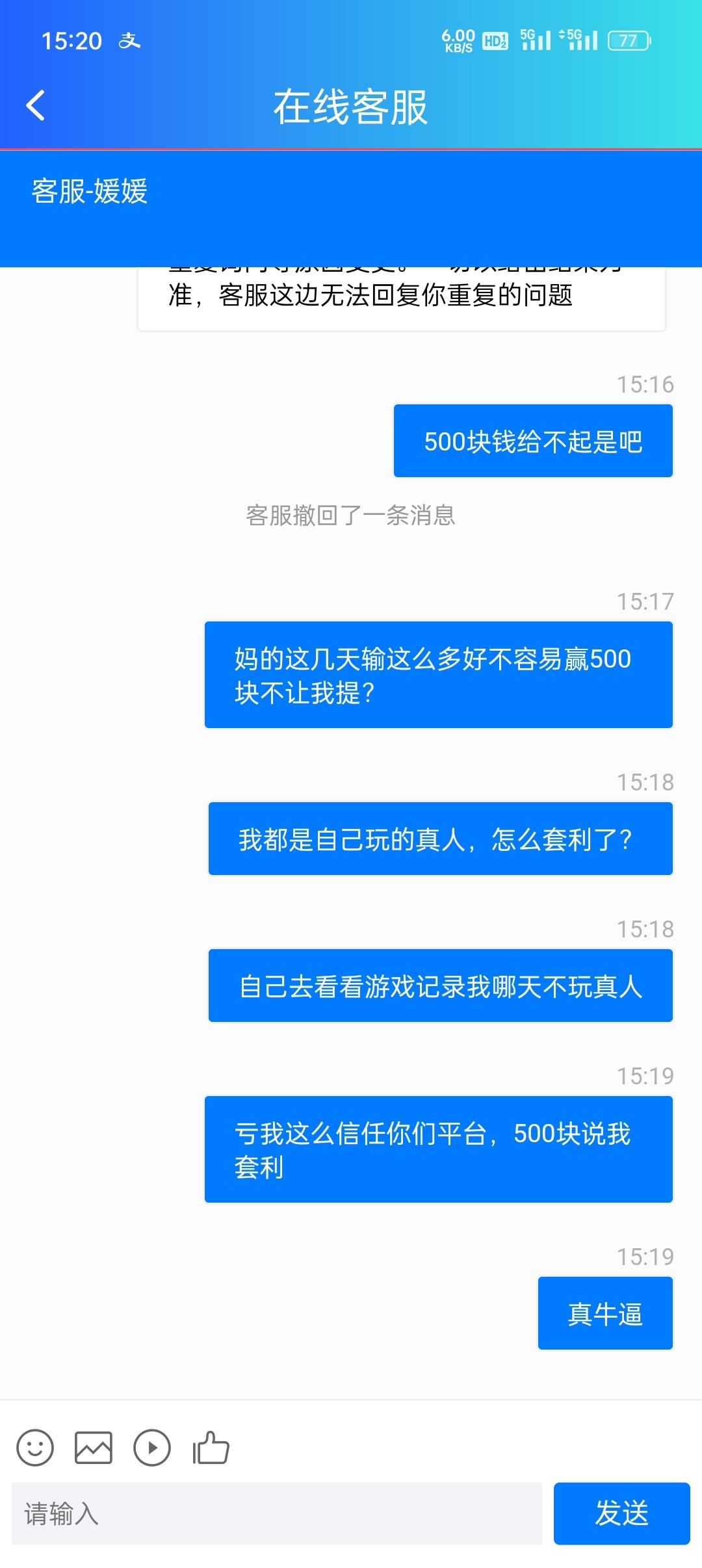 输不起的台子,之前有个新人领18的活动,领了之后没卸载,一直在这个平台玩,也是输多赢少,天天领了40块彩金,打到521提现不让提,说我套利,玩不起的玩意,大家注意就行了。