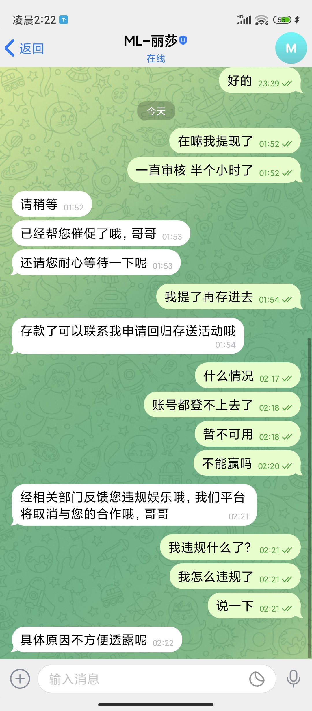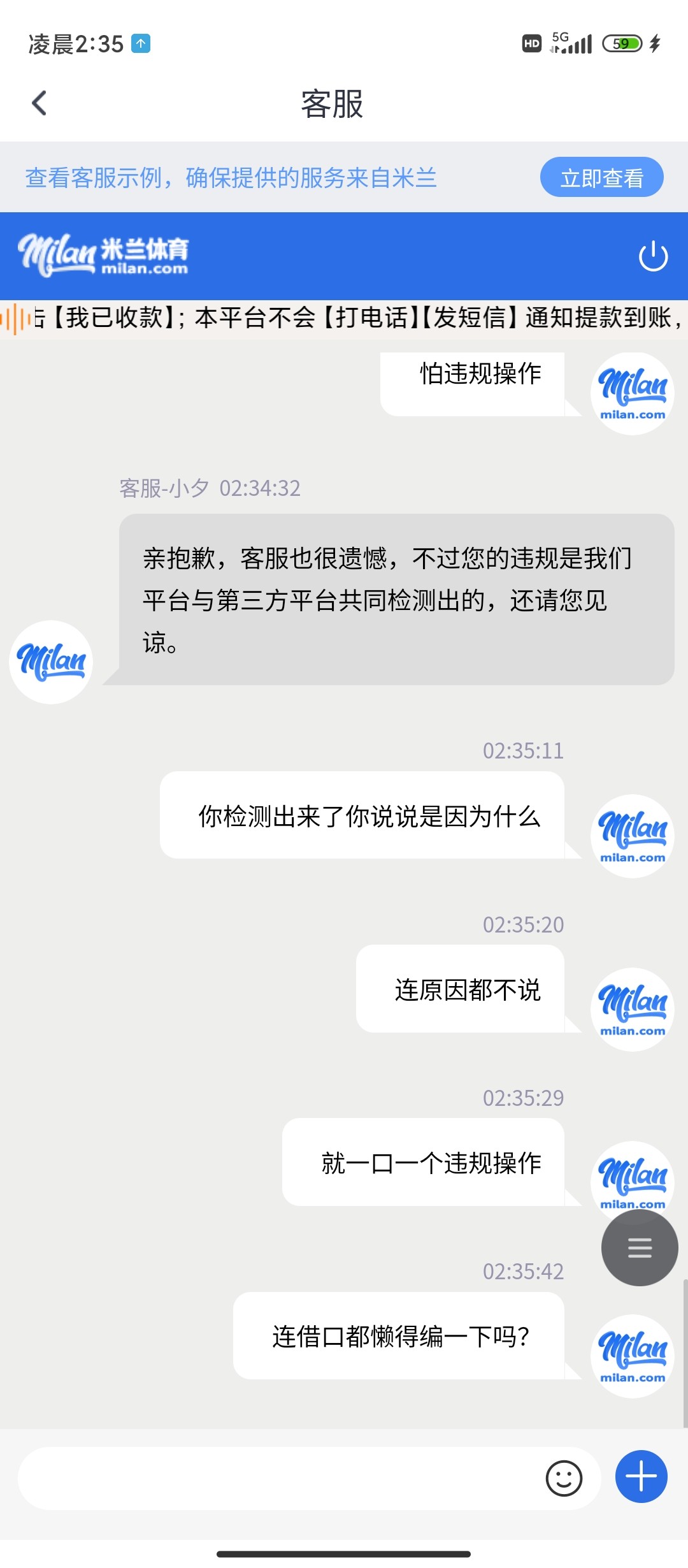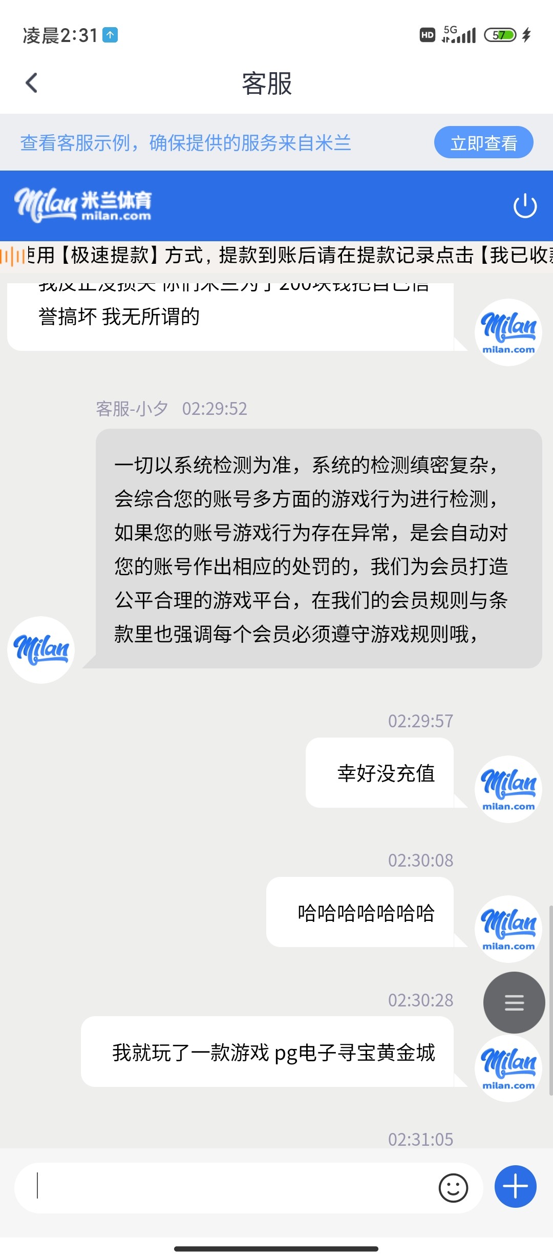米兰体育 黑台 送的回归彩金不能让你赢 赢就封号,送了58 只玩了pg电子里面的寻宝黄金城4毛钱的注,买了很多次免费,赢到了218提现,一直审核,过了一个多小时账号被退了,重新登陆账号暂不能用,直接封号,能送你彩金但是你不能提,提现就封你号,米兰真牛逼哈哈哈,玩电子能玩出违规来,让客服举个例子也举不出来,就是封你号你能咋滴