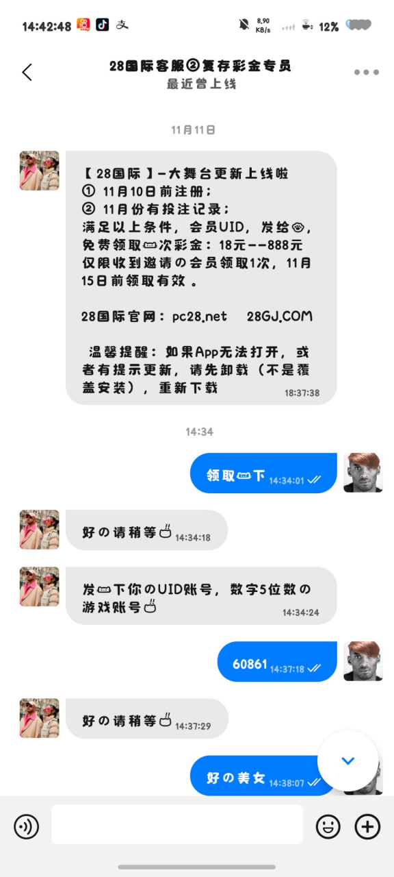 历史有账号的登录添加28官网客服旺旺,领取18-88彩金,这个台子以前就发过白嫖,可以自己去试试,禁止存款!